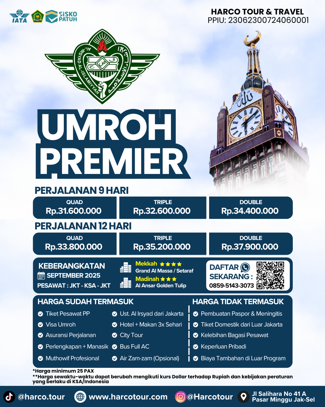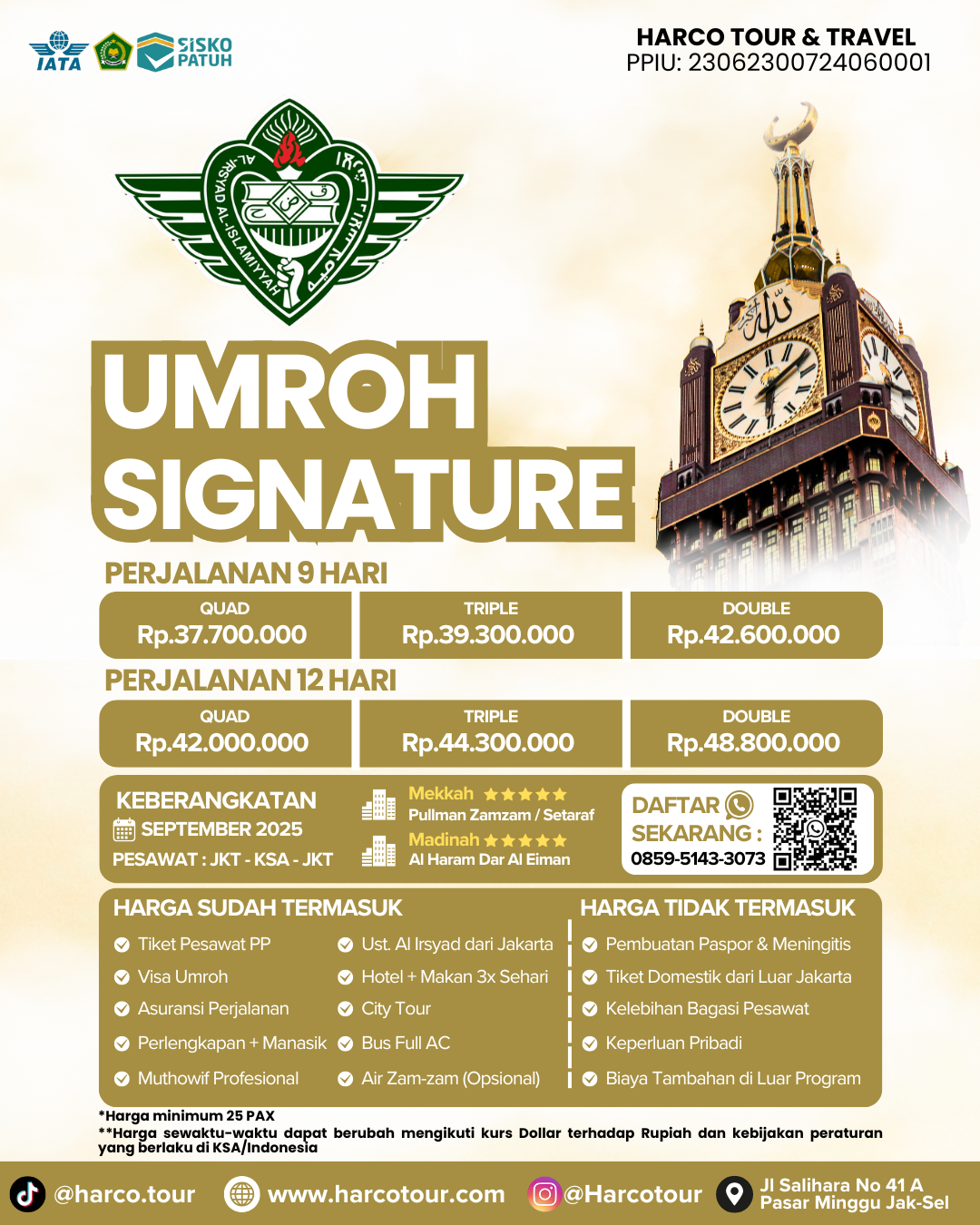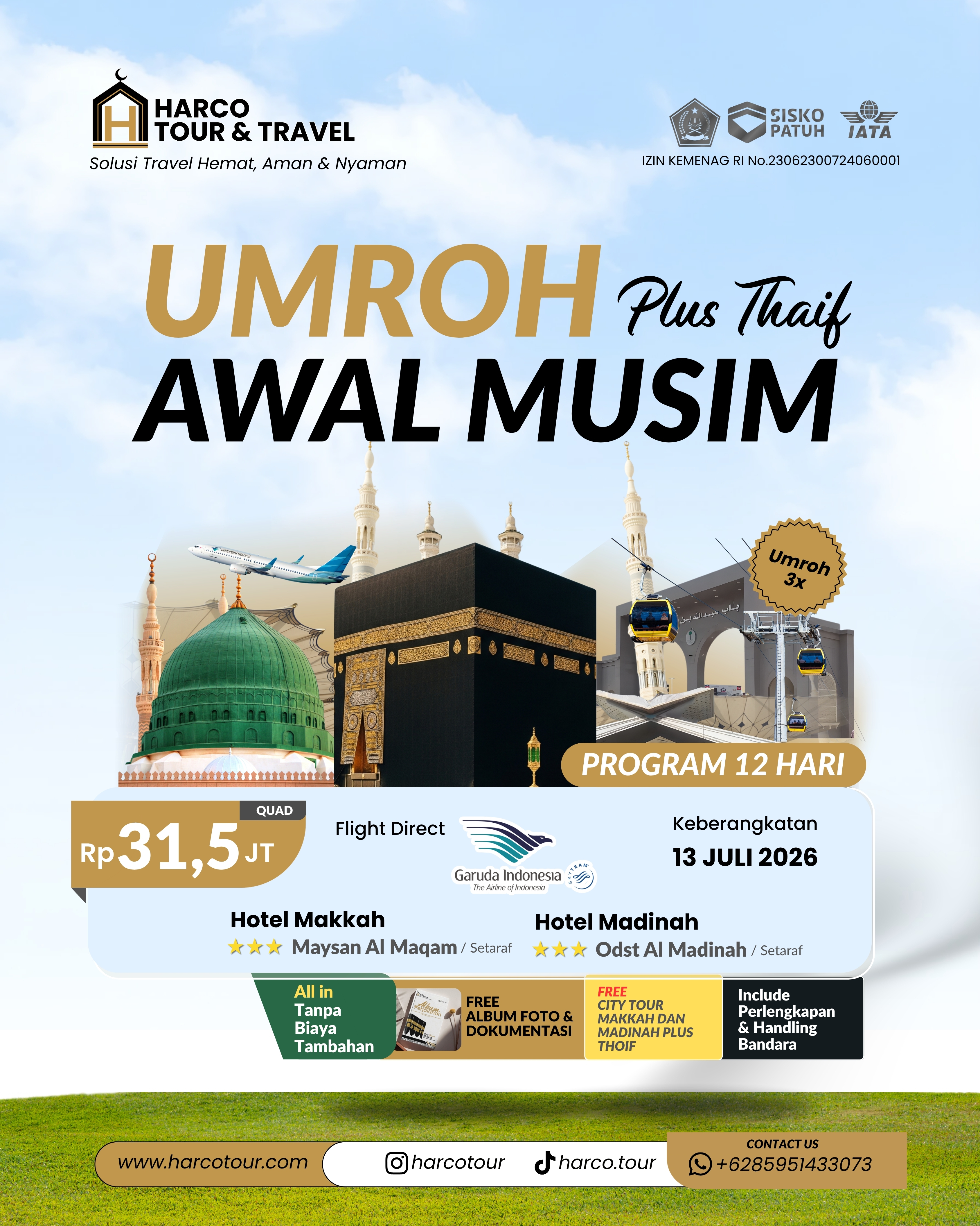 Untuk ibadah umroh kami telah memiliki izin dari Kemenag RI dengan nomor 23062300724060001 dan kami bermitra dengan muassasah terkemuka di Kerajaan Saudi Arabia.