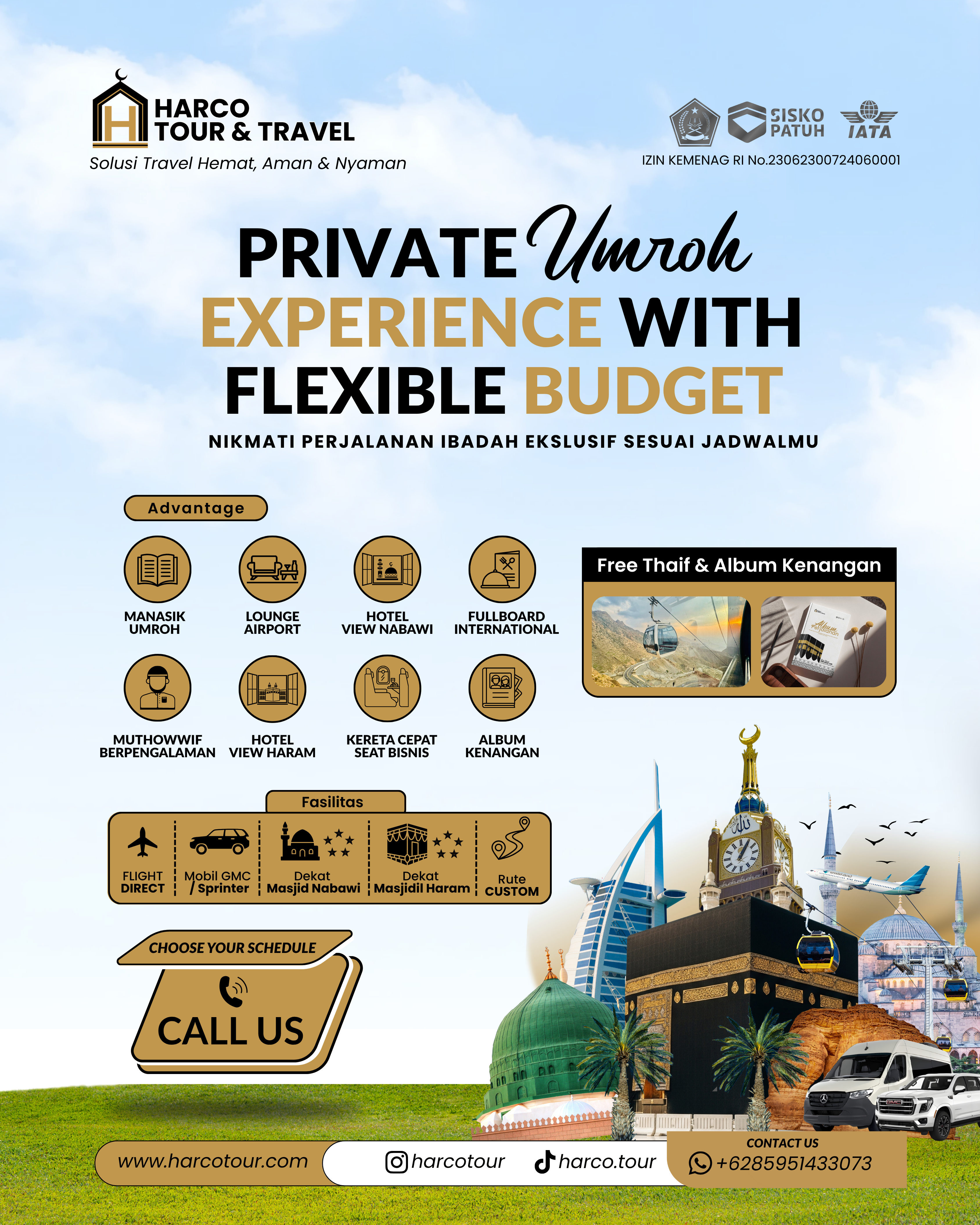 Paket Umroh Private: Dapat disesuaikan dengan permintaan Jamaah, mulai dari jadwal keberangkatan, akomodasi, dan layanan lainnya. Untuk info selanjutnya, HUBUNGI KAMI: +6285951433073 / +6281514522278